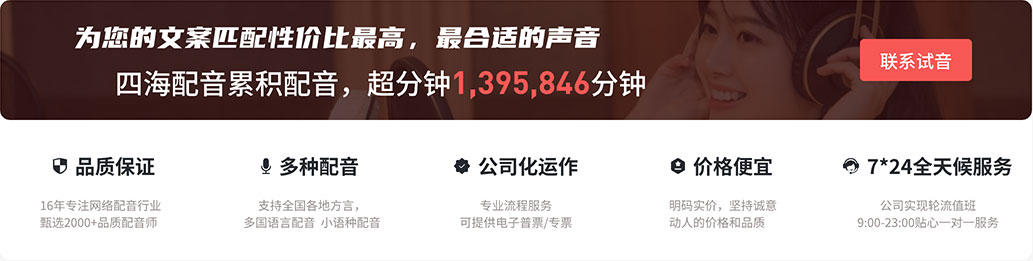 注:價格不含稅,咨詢客服本站標(biāo)注配音價格供參考,客服有權(quán)根據(jù)實際稿子難度計價,每位老師均有起錄價。              支持正規(guī)發(fā)票開具